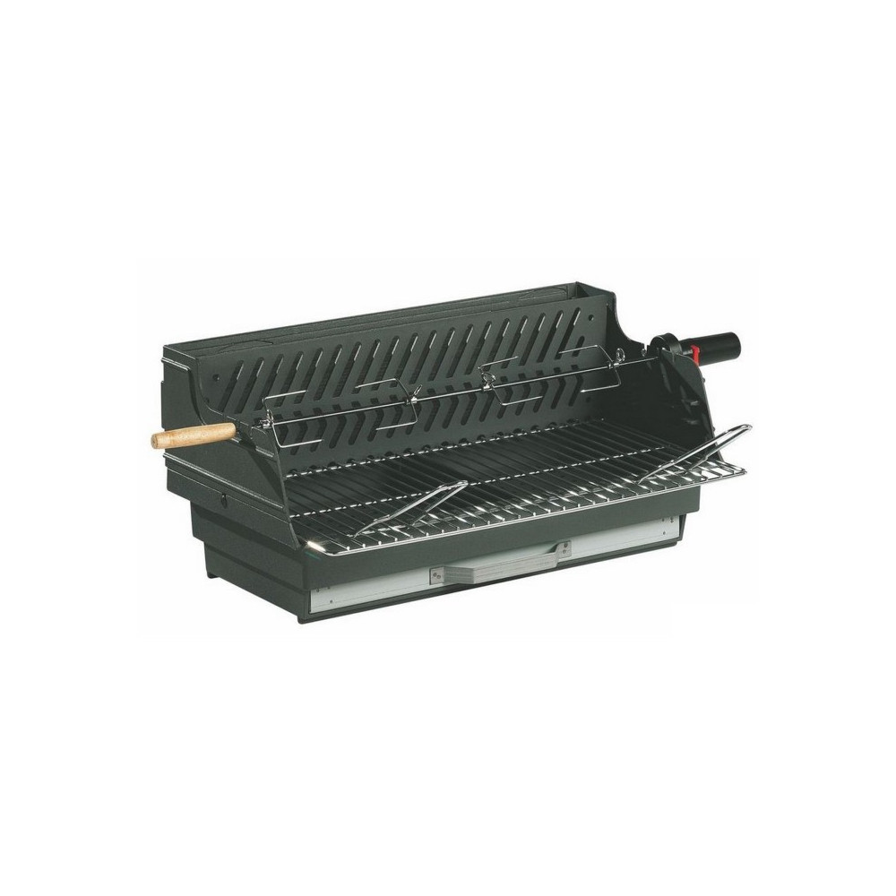 Pour la rôtissoire, le combustible chauffe par radiation et évite l’inflammation des graisses. Positions multiples pour la broche.