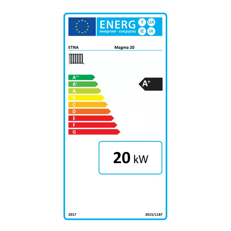 Découvrez la chaudière à bois ETNA Magma, disponible en modèles de 20, 30 et 40 KW. La chaudière Magma 20kW est parfaitement adaptée pour chauffer efficacement des surfaces jusqu’à 120m². Conçue pour offrir une efficacité énergétique optimale avec un rendement impressionnant de 83 %, cette chaudière robuste et compacte est de classe d’efficacité énergétique A+, ce qui garantit une consommation réduite et un impact environnemental minimal, en conformité avec la Directive européenne 2015:1189.