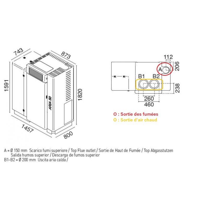 - Sortie d’air chaud supérieur : 2 sorties de diamètre 20 cm