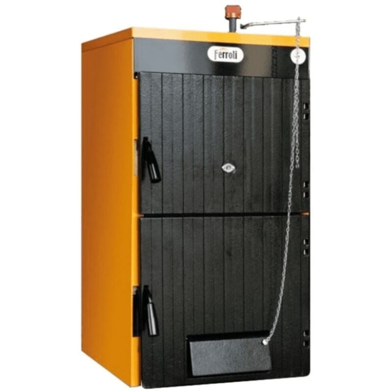 Chaudière à bois FERROLI SFL 4 conçue pour un chauffage individuel avec une puissance nominale de 27 kW. Adaptée à la combustion de bûches, elle offre une construction robuste en fonte G20 avec une isolation épaisse en laine de verre, permettant une efficacité thermique optimale.