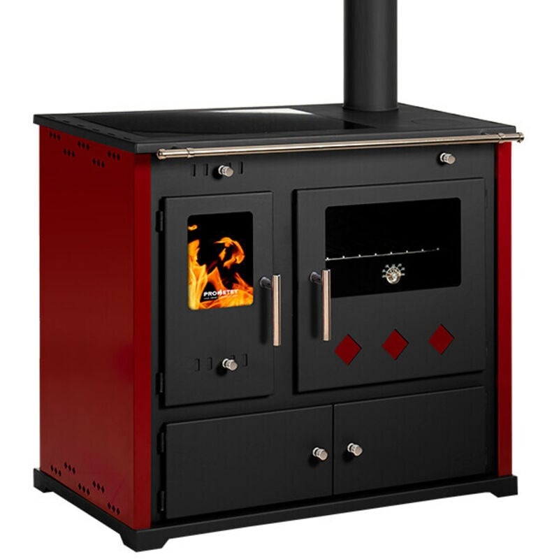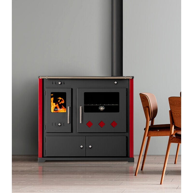 Cuisinière à Bois avec Plaque en Céramique – 9,5 kW Panneaux Latéraux Peints en Rouge et Design Moderne