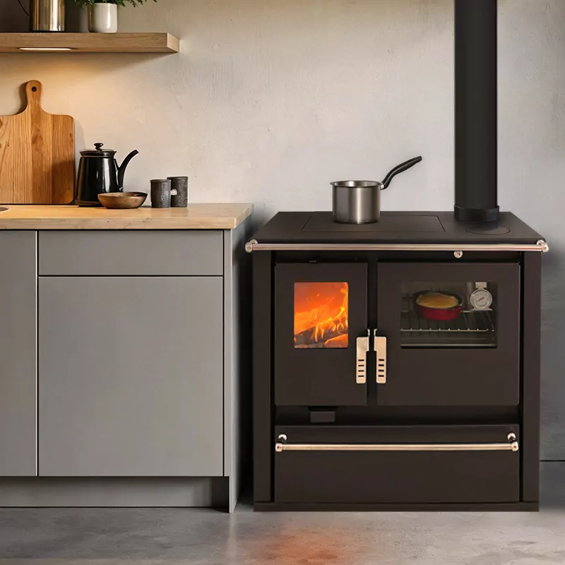 Le cendrier amovible simplifie l’entretien en collectant les cendres en un point accessible. La vitre céramique haute température garantit une vue dégagée sur les flammes tout en réduisant les dépôts de suie. Avec son pare-bûche, la cuisinière assure une sécurité optimale en maintenant les bûches en place et en évitant tout basculement.
