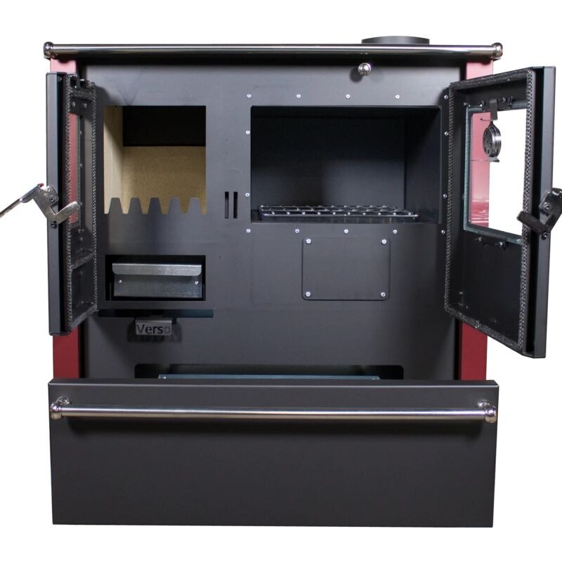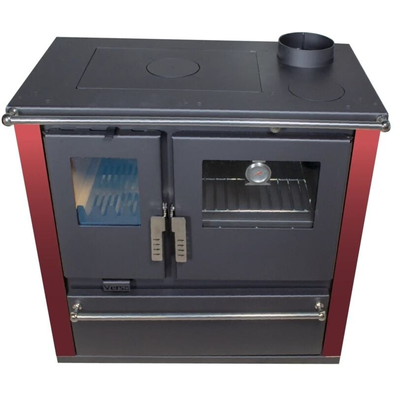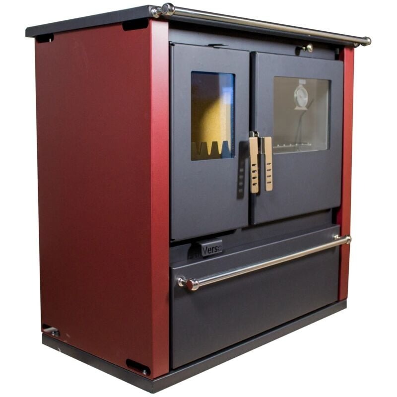 Cuisinière à Bois Verso CS Plus – 7,7 kW Plaque Supérieure en Métal, Four Inox et Panneaux Latéraux Peints Bordeaux
