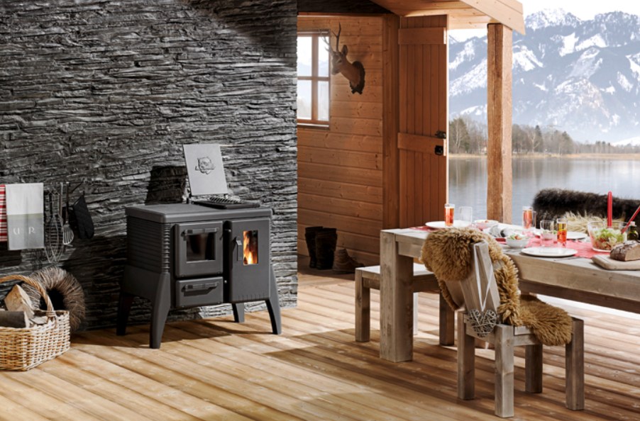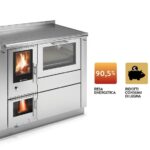 Cuisinière bois Iron Dog 06 en fonte avec four de 8 kW. Rendement 82 %. Dimensions H 81 x L 94 x H 63 cm Dimensions du four H 16 x 20 cm Ouverture du foyer H 24 x L 27 mm Sortie de fumée en haut/panneau arrière et diamètre 130 mm. Quantité de combustible autorisée 2 – 3 kg, Profondeur du foyer 45 cm,