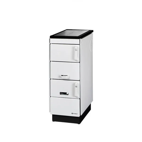 La cuisinière HKK 32/60 est équipée d’une plaque de cuisson en acier et est disponible en deux versions. Vous pouvez choisir entre le blanc et le noir. Le poêle à bois est équipé de deux grilles. La grille d’été supérieure fixe pour une cuisson à plat optimise la consommation de combustible pendant les mois d’été. La grille inférieure, en revanche, peut être secouée, ce qui facilite grandement le nettoyage. Pour le fonctionnement en hiver, il suffit de retirer la grille supérieure pour permettre la cuisson du puits de remplissage. La combustion peut être contrôlée de manière détendue en régulant l’alimentation en air. Les gaz d’échappement qui en résultent sont évacués par le raccord du tuyau d’évacuation de 120 mm de large.
