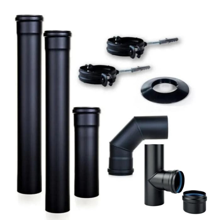 Installez votre poêle à granulés avec un Kit de Tuyaux d’Evacuation de Fumée (pour poêle non hermétique) en acier peint en noir complet avec joints de 80 mm