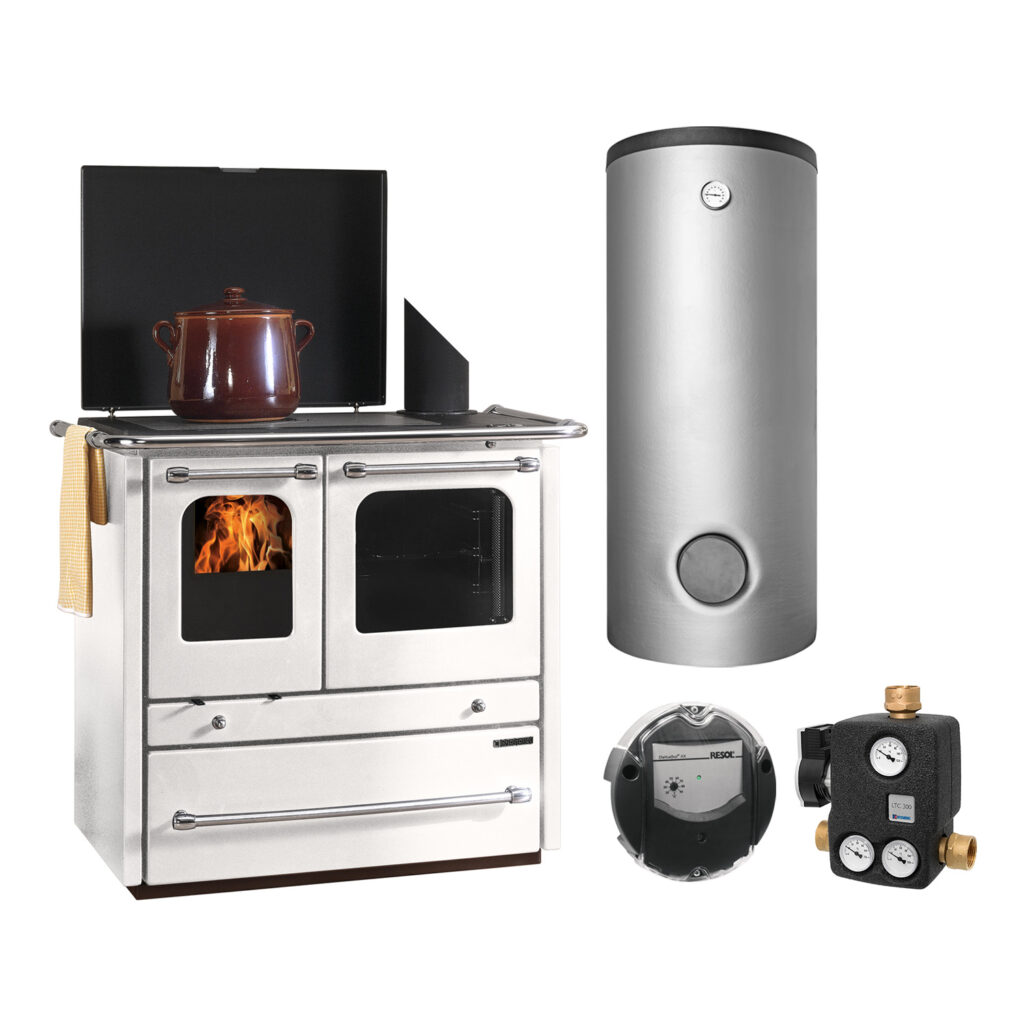 Cette belle et massive cuisinière à bois de 15,5 kW Termorosa en Bordeaux possède une chambre à eau pour le raccordement à votre chauffage central et assure ainsi une chaleur agréable à l’emplacement d’installation ainsi que dans toute la maison. Outre l’intégration dans votre système de chauffage, le raccordement à la production d’eau chaude sanitaire est également possible. La construction massive avec toutes les pièces pertinentes en fonte garantit une longue durée de vie et une apparence de haute qualité du poêle à bois. Comme caractéristique particulière, cette cuisinière à bois bouilleur est capable, indépendamment de l’électricité, du gaz ou du pétrole, d’assumer les fonctions de cuisson et de cuisson au four courantes dans n’importe quelle cuisine. Elle dispose d’une surface de cuisson et d’un compartiment four complet avec thermomètre. Grâce à une alimentation en air primaire, secondaire et tertiaire réglable séparément, le processus de combustion peut être optimisé.