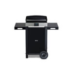 Panneaux latéraux de grande qualité en fonte d’aluminium sur le couvercle et la chambre de combustion ; couvercle double paroi en inox avec thermomètre intégré ; 2 grandes tablettes latérales rabattables en acier inoxydable avec panneau de stockage supplémentaire à l’avant ; panneau de commande, tablettes latérales et portes à double paroi en inox