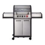 Brûleur arrière infrarouge (3,5 kW) : pour des viandes à la fois juteuses et croustillantes ; foyer latéral (2,9 kW) : pour la préparation des accompagnements ; peut également servir de surface de stockage une fois le couvercle fermé ; une vaste grille de maintien au chaud en inox qui se déploie à l’ouverture du couvercle ; 3 brûleurs en inox pour une puissante cuisson directe ou indirecte ; large hublot panoramique pour surveiller la cuisson de vos aliments