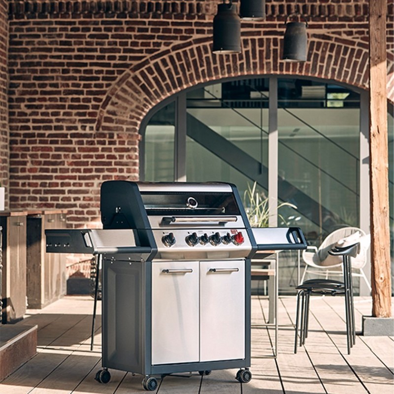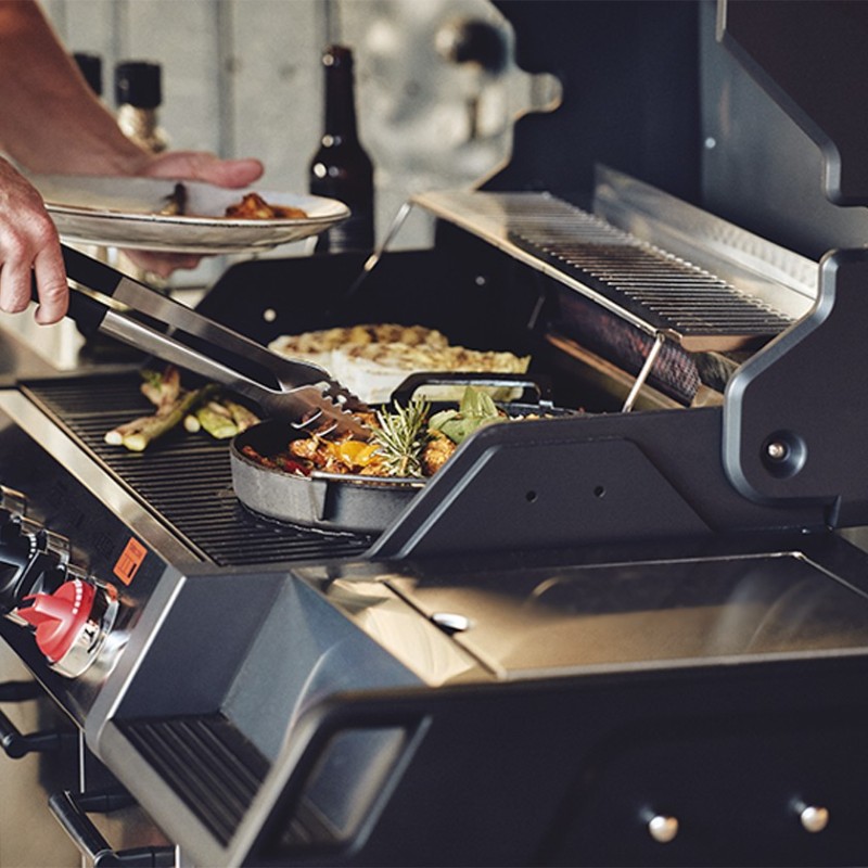 Brûleur arrière infrarouge (3,5 kW) : pour des viandes à la fois juteuses et croustillantes ; foyer latéral (2,9 kW) : pour la préparation des accompagnements ; peut également servir de surface de stockage une fois le couvercle fermé ; une vaste grille de maintien au chaud en inox qui se déploie à l’ouverture du couvercle ; 4 brûleurs en inox pour une puissante cuisson directe ou indirecte ; large hublot panoramique pour surveiller la cuisson de vos aliments