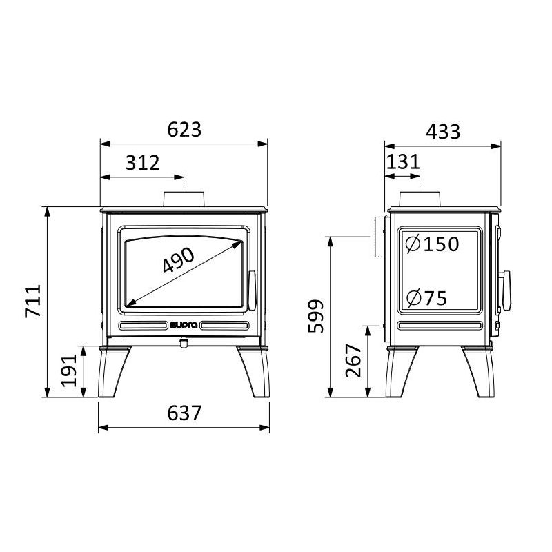 Schéma techniquedu Poêle à bois en fonte – SUPRA Georges 6.7 kW